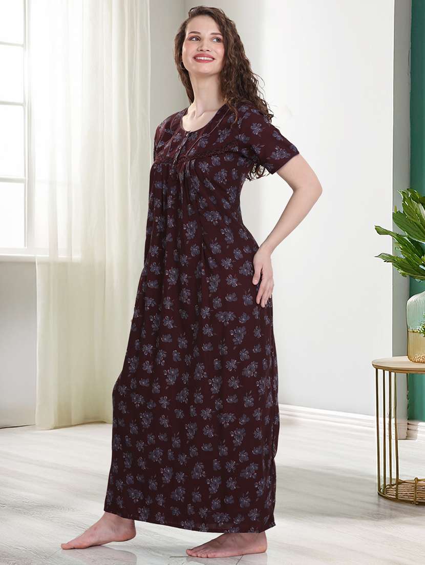 Quira Women's Poly Cotton Printed Nighty - Half Sleeves, Round Neck, Full Length