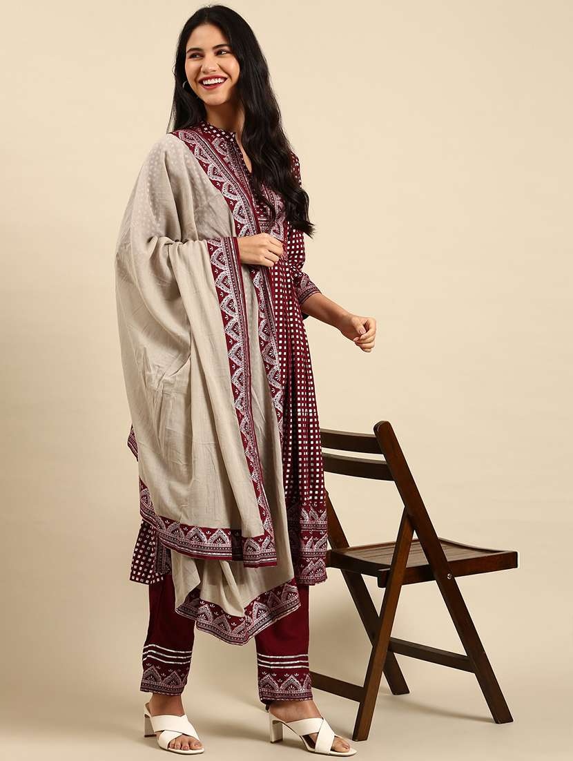 - Find gorgeous sets of ethnic wears in trending designs in maroon colors suitable for casual wear of occasions.