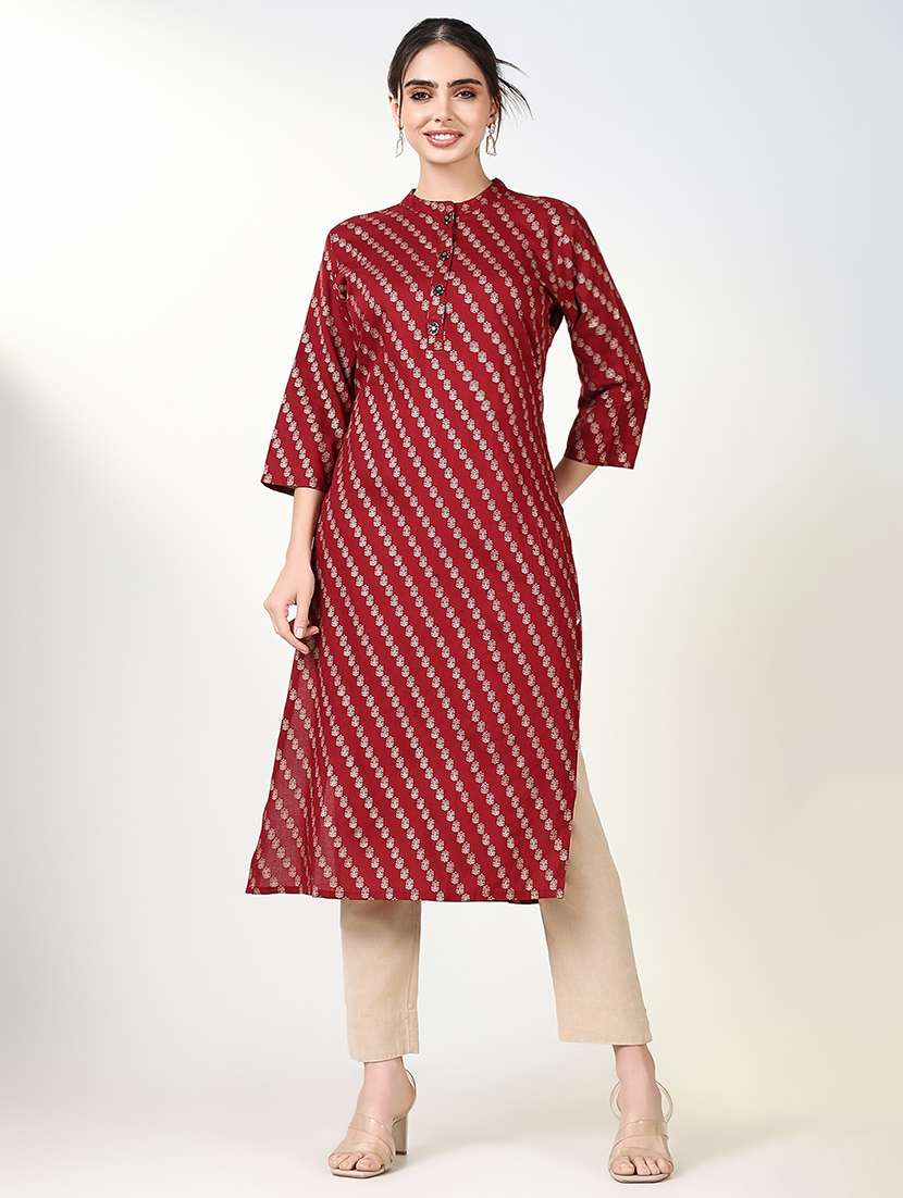 - » women maroon printed three quarter sleeve straight kurta