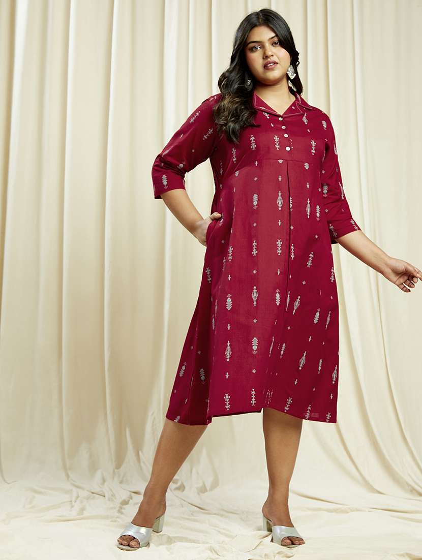 globus gloplus women maroon notch lapel ethnic print button down plus size a-line midi dress
