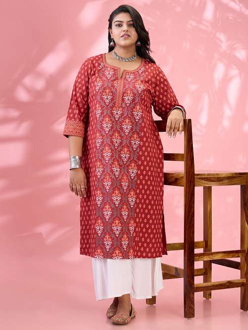 - » globus gloplus women maroon round neck ethnic & floral print panelled straight plus size kurta