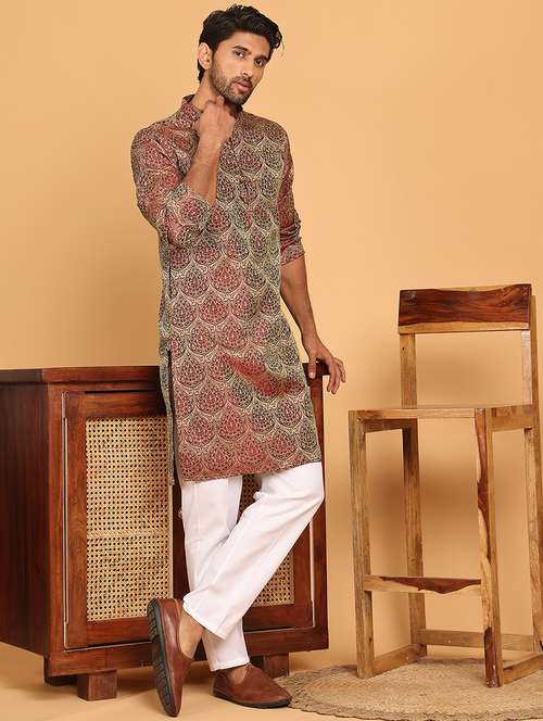 Men Maroon Silk Blend Straight Kurta Pyjama Set