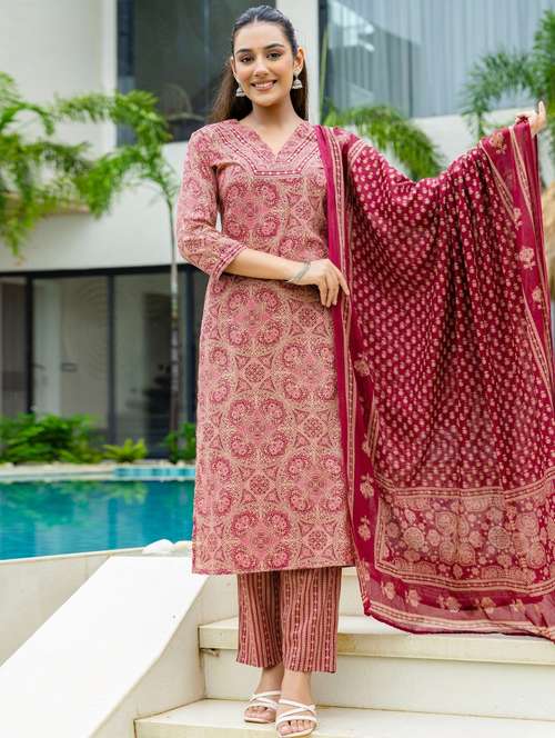 - Find gorgeous sets of ethnic wears in trending designs in maroon colors suitable for casual wear of occasions.