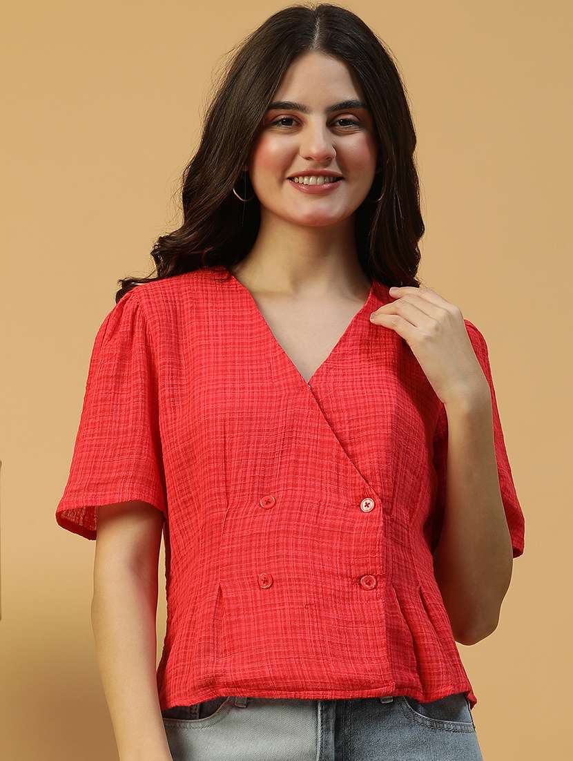 This Starling Red Button Detailed Short Sleeve Women Cotton Dobby Top is a stylish and versatile piece perfect for casual or semi-formal occasions. Made from breathable cotton fabric with a textured dobby pattern, it ensures comfort and a chic look. The V-neck design enhances its flattering silhouette, while the button detailing adds a modern look. With short sleeves for a relaxed fit, this top pairs effortlessly with jeans, skirts, or trousers, making it an essential addition to any wardrobe. Whether dressing up or down, this top offers both style and comfort for everyday wear.