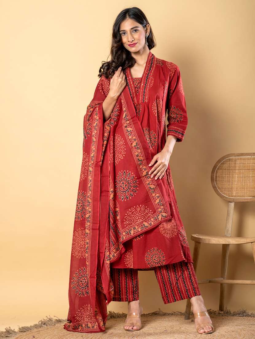 - Find gorgeous sets of ethnic wears in trending designs in maroon colors suitable for casual wear of occasions.