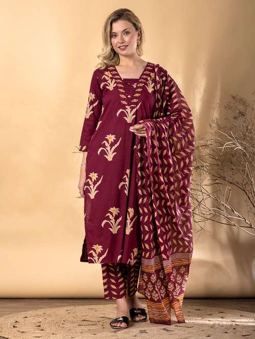 - Find gorgeous sets of ethnic wears in trending designs in maroon colors suitable for casual wear of occasions.