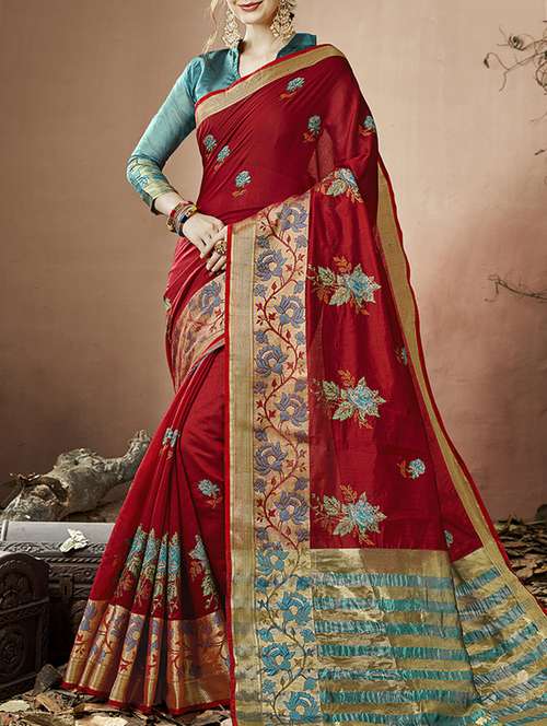 thread embroidered striped pallu saree with blouse - 15351373 - Very Small Image - 1