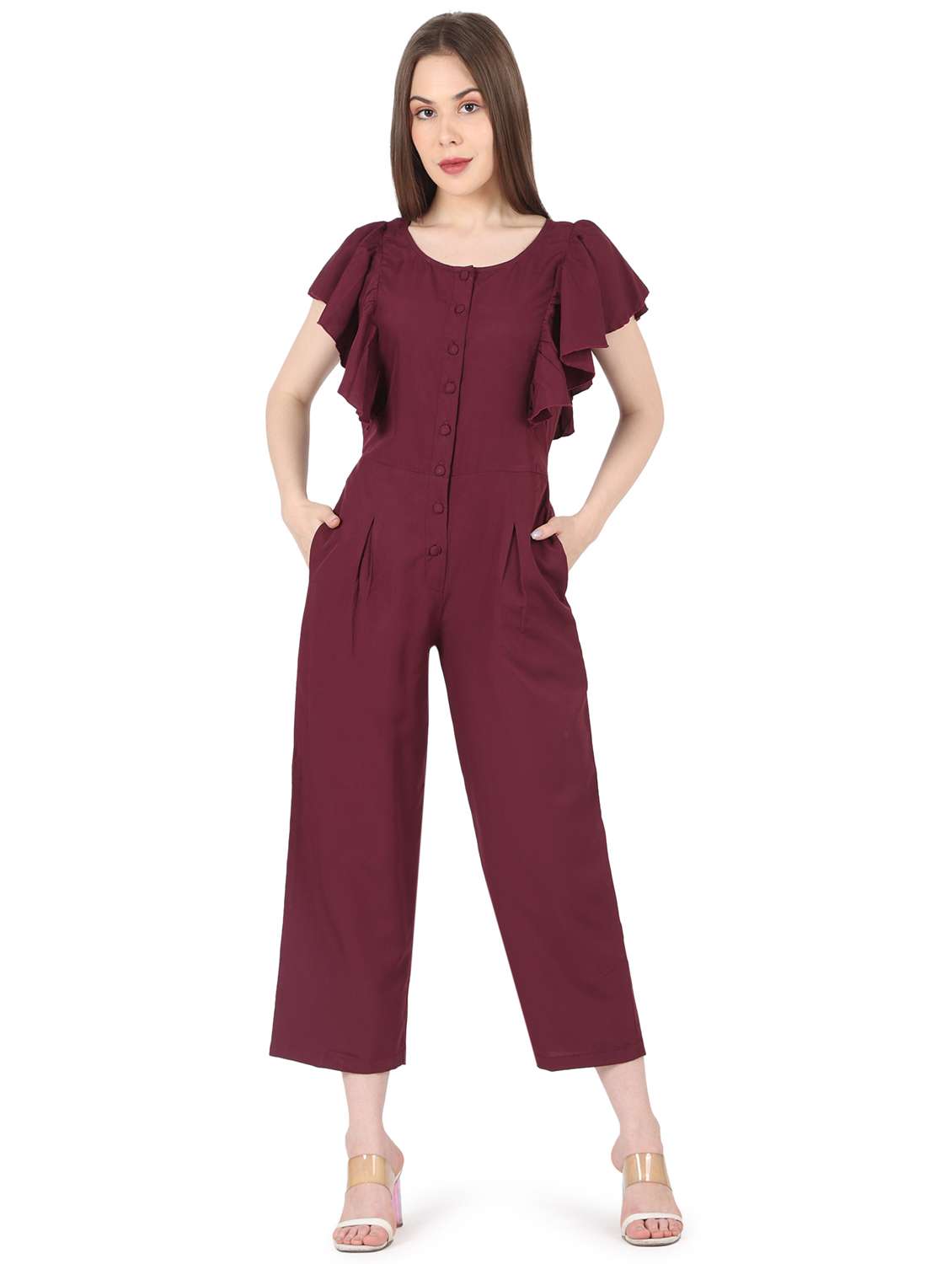 women maroon crepe three fourth jumpsuit