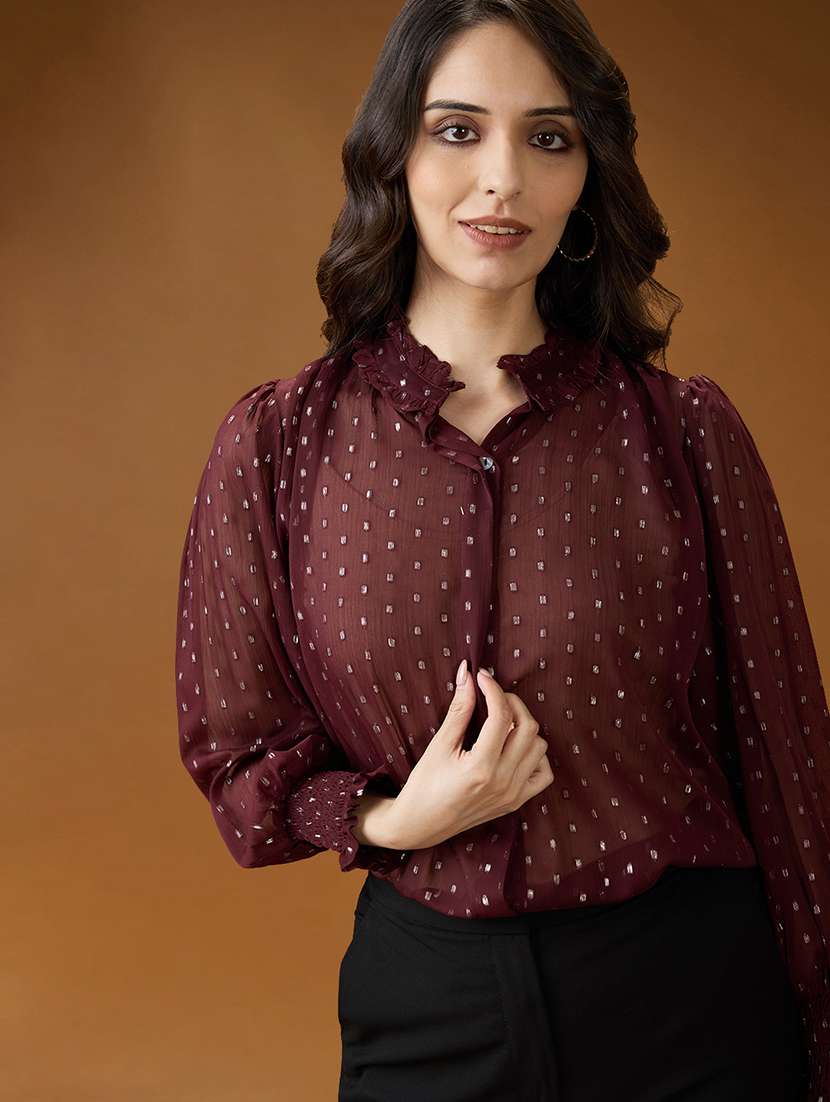 - » globus women maroon frilled neck bishop sleeves lurex detail georgette shirt style top