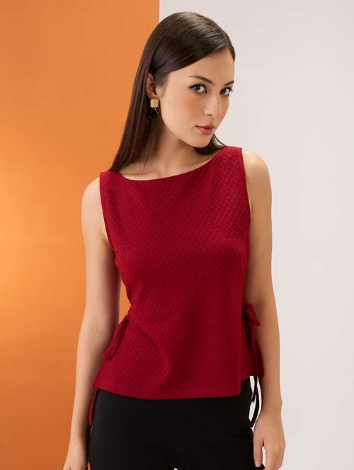 - » women maroon self design boat neck sleeveless waist tie-up top