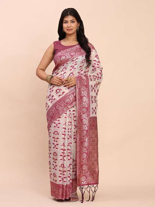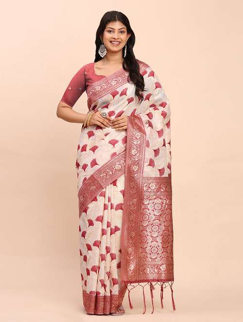Step into elegance with this off-white and Maroon linen cotton saree, designed with charming Maroon woven motifs and a shimmering zari pallu. Light, breathable, and graceful – this saree is ideal for daily sophistication or festive flair.