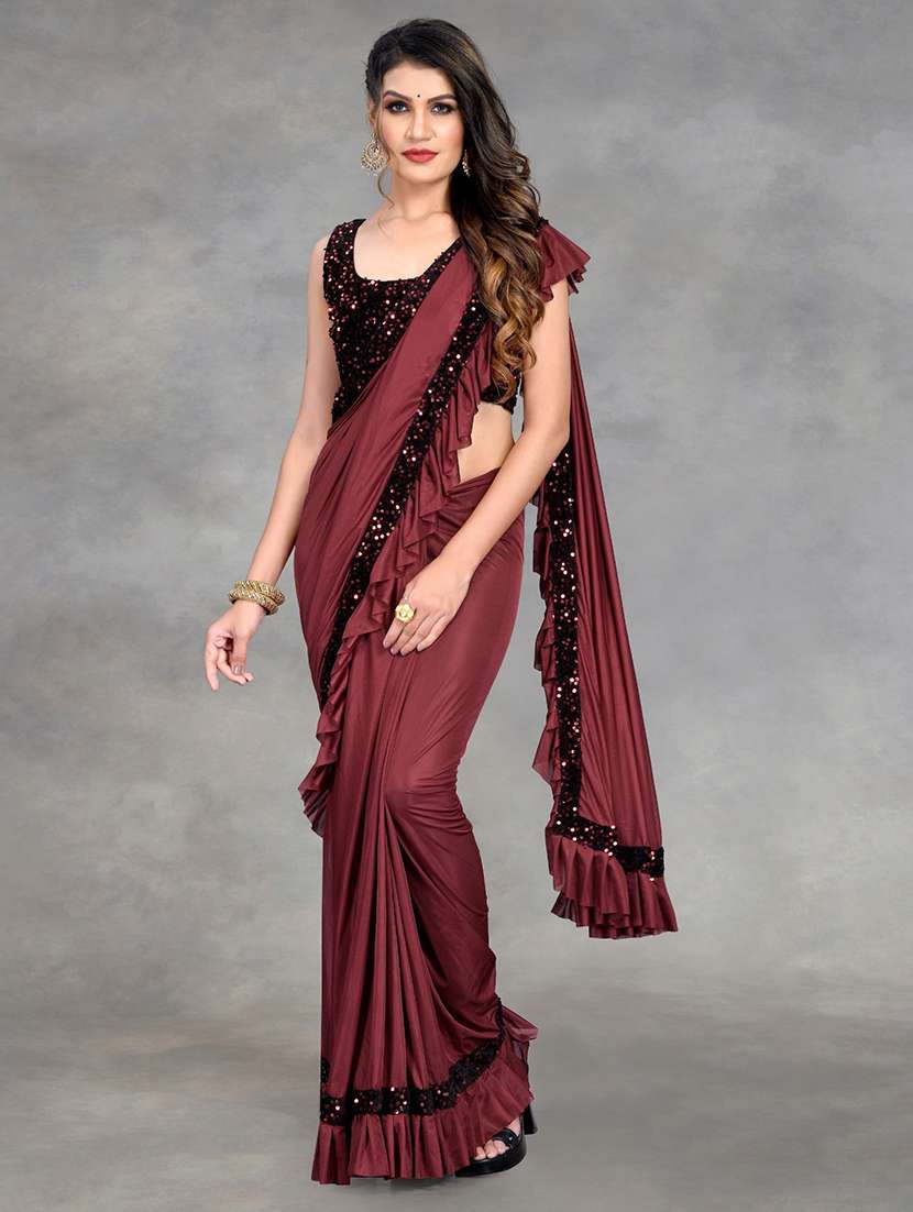 Fabric: Lycra, Work : Squence Embroidered, Saree Length of 5.25 meters in Maroon Color, The saree comes with a blouse piece 0.75 meter Velvet Squence Embroidered Work. It is unstitched and can be altered according to your fit and style that you require