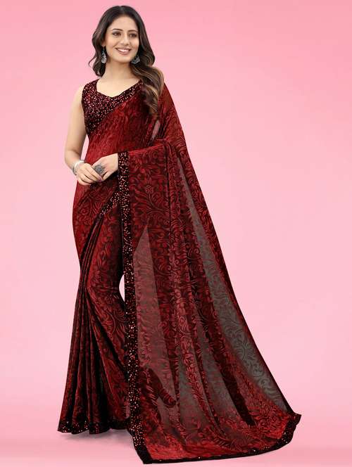 Elevate your ethnic wardrobe with this mesmerizing emerald saree, crafted in luxurious velvet-touch fabric. Adorned with delicate sequin work along the border and blouse, it exudes regal charm with a modern twist. The saree features intricate floral patterns woven into the fabric, adding texture and depth, while the shimmering sequin accents bring just the right amount of sparkl for festive evenings or special occasions.\r