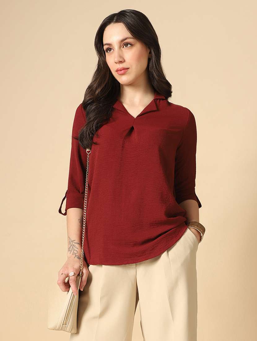 Upgrade your office wardrobe with this maroon shirt-style top, tailored in poly-cotton for a breathable, comfortable fit. The Cuban collar and roll-up three-quarter sleeves give it a smart, structured appearance, ideal for formal or semi-formal settings. Designed with minimal detailing and a woven finish, it adds a clean, polished look to your outfit. Its gathered or pleated accents offer subtle elegance without overpowering the ensemble. Pair with tailored trousers or skirts for a professional edge. Machine washable and low maintenance