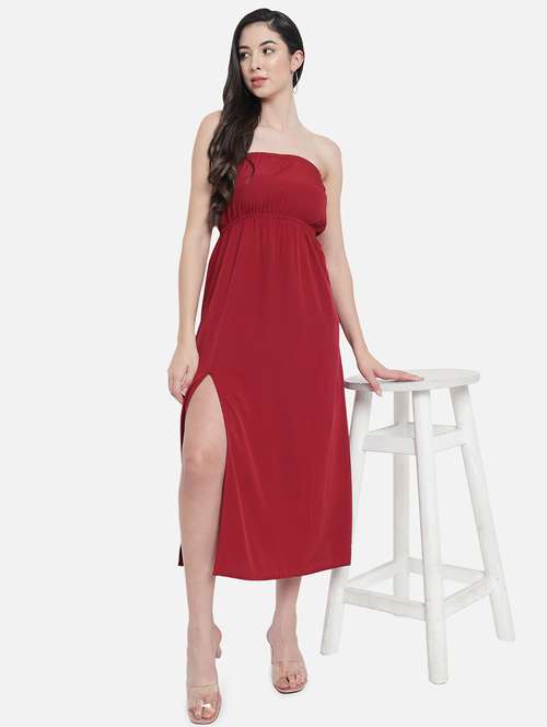 Embrace chic simplicity with the OTIRA Women's Maroon Solid Sleeveless Crepe Midi Tube Dress for Women. This timeless dress features a sleek tube silhouette, flattering your figure in all the right places. The maroon color is versatile and easy to accessorize, making it a versatile option for any occasion. Whether you dress it up with heels and statement jewelry or keep it casual with sandals and a denim jacket, this dress is a wardrobe essential. Elevate your style with this elegant and versatile piece today.