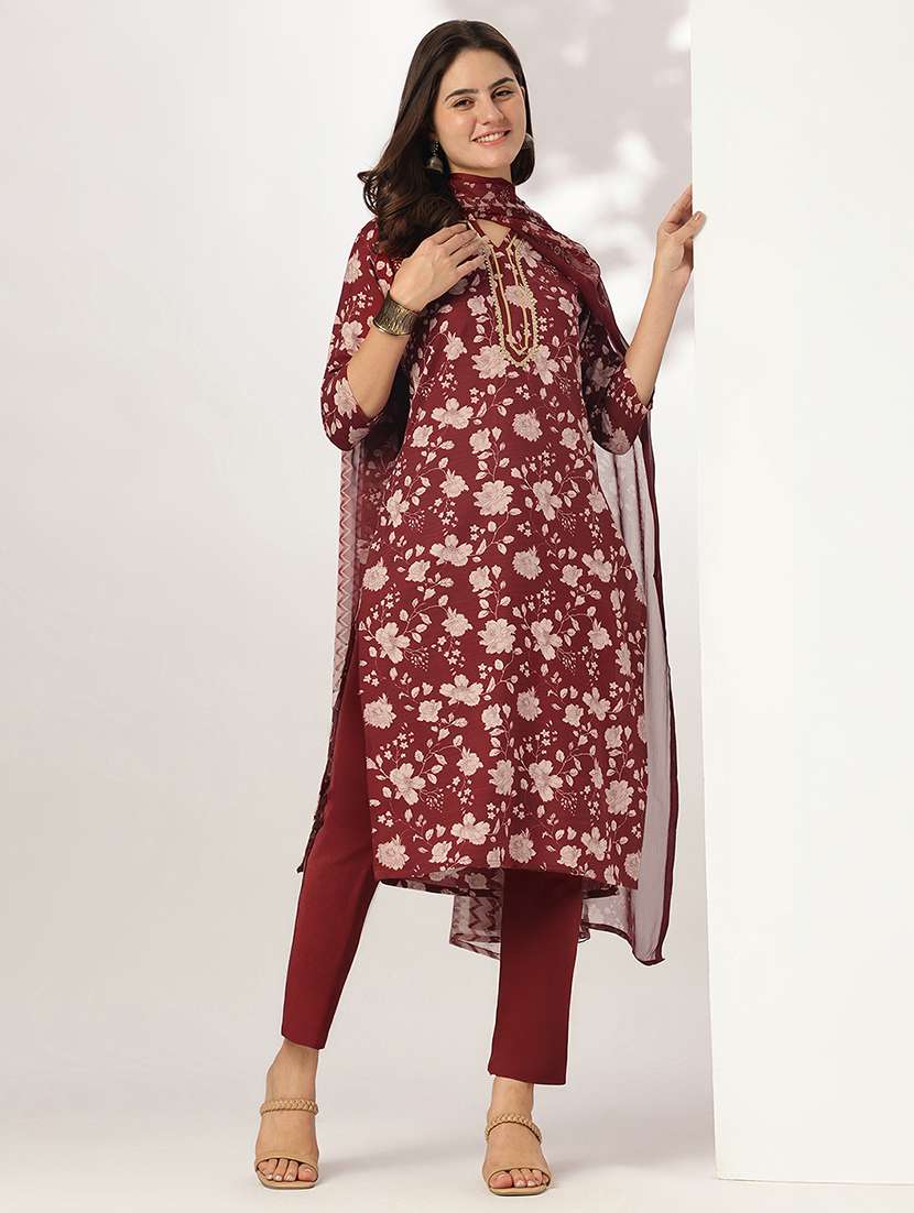 • Find gorgeous sets of ethnic wears in trending designs in maroon colors suitable for casual wear of occasions.