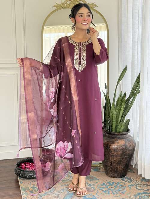 - Find gorgeous sets of ethnic wears in trending designs in purple colors suitable for festive wear of occasions.