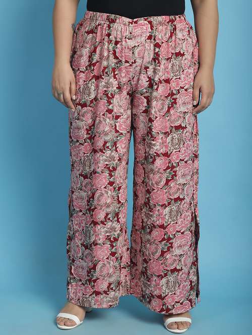 theRebelinme Plus Size Women's Maroon Rose floral printed Wide Leg High-Rise Trouser, has an elasticated waistband, slip on closures, side slit detail and flared hem.