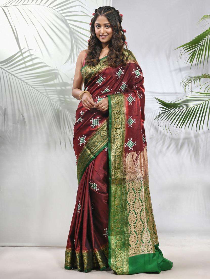 Walk with poise and youthfulness in this maroon silk blend handwoven saree. It has embroidered motifs all over body. The borders have zari woven nakshi design along the length. the pallu is in zari for a charming appeal.