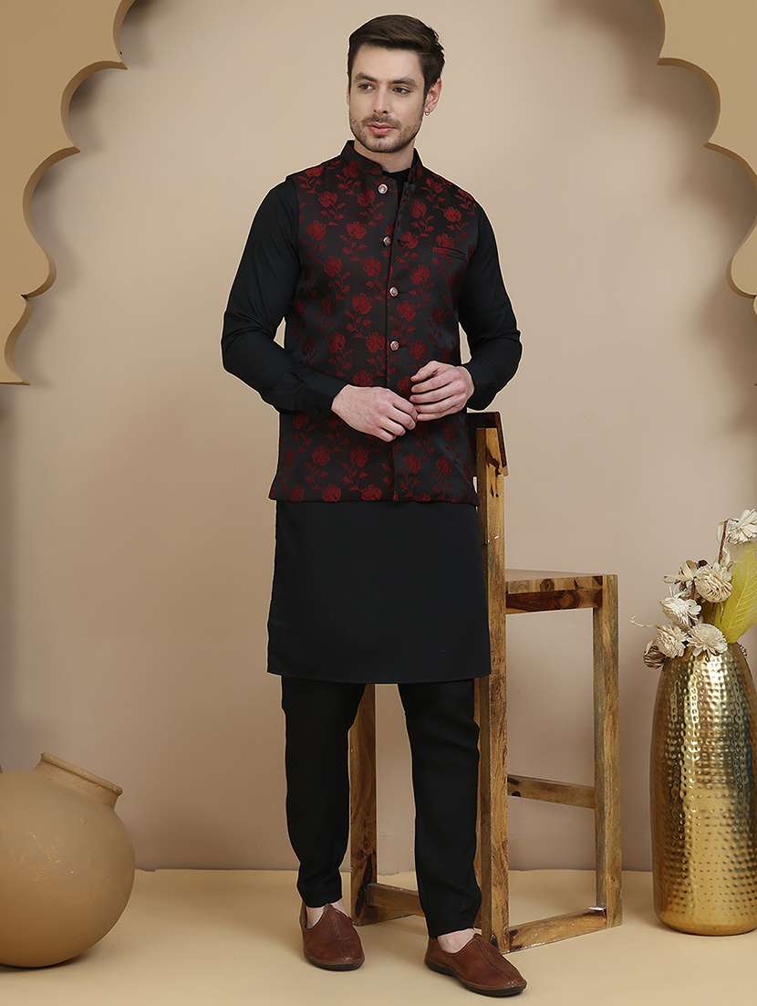 this classy black kurta set, paired with a striking Maroon embossed Nehru jacket featuring a subtle floral pattern. Crafted from premium fabric for a sleek silhouette,Ideal for festive occasions, weddings, and cultural celebrations,