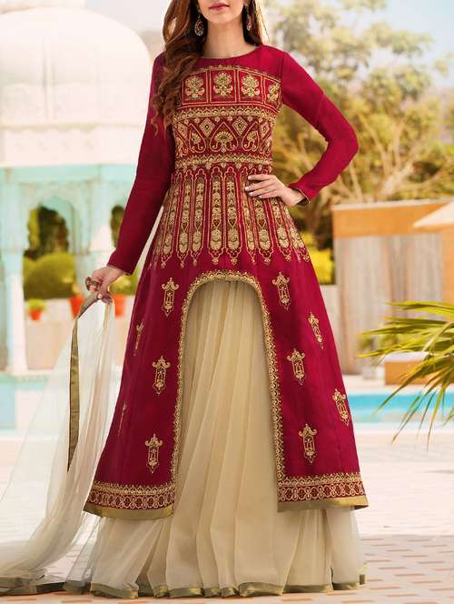 embroidered high low semi-stitched suit
