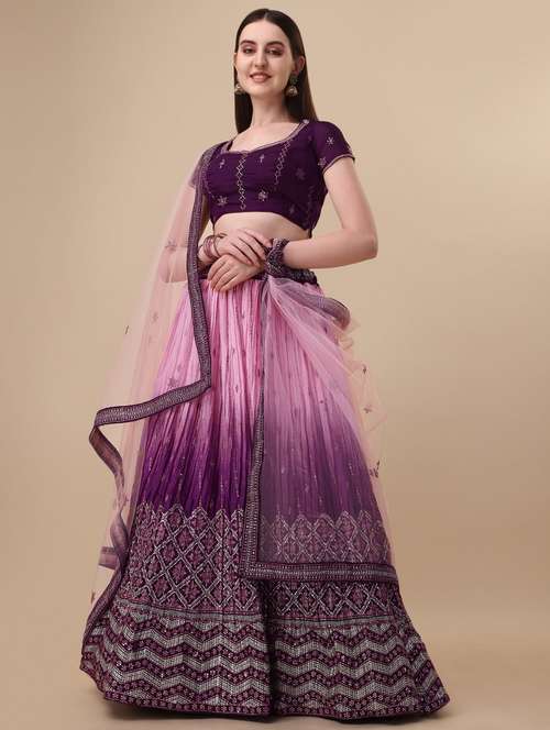 This Silk Vaidehi Fashion Silk Sequence & Embroidery Lehenga Choli will make you stand out from the crowd! It features a beautiful purple Silk fabric adorned with shimmering gold sequins, a stylish contrast border, and a can-can underskirt for added volume and bounce. Can-Can is a mesh or net-like material that can be attached underneath your lehenga to give it a royal flare. The choli is intricately embroidered with gold sequins, pearls, and beads to create an eye-catching look. This lehenga choli is perfect for special occasions like weddings, festivals, and parties. Show off your unique style and make a statement with this must-have lehenga choli!