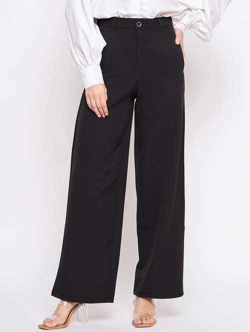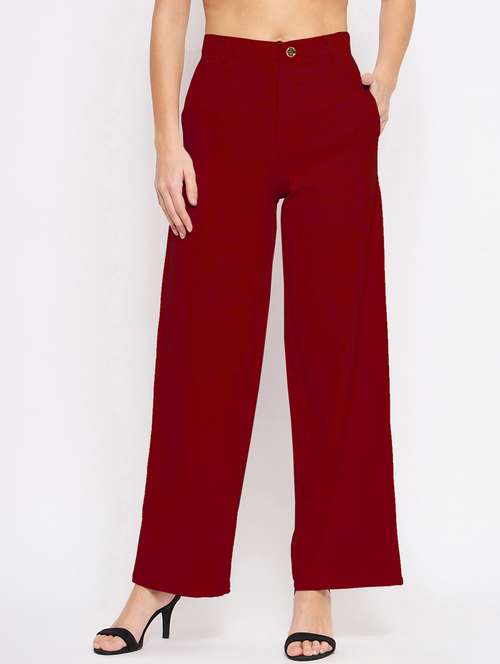 TULIP 21 Women Solid Maroon Wide Leg High Waist Trousers has Two Pockets with Zip and Button Closure.