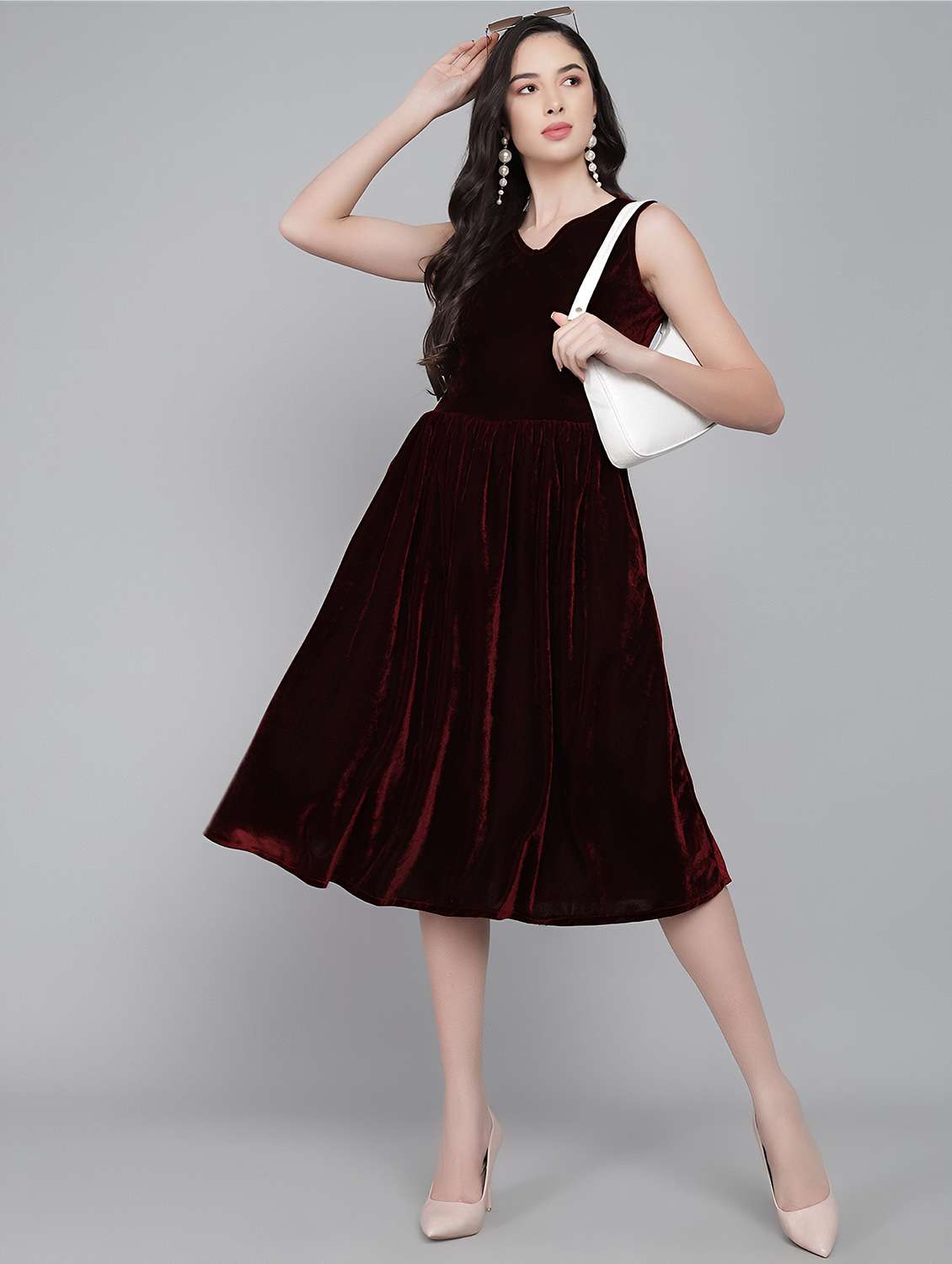 solid maroon velvet fit & flare dress