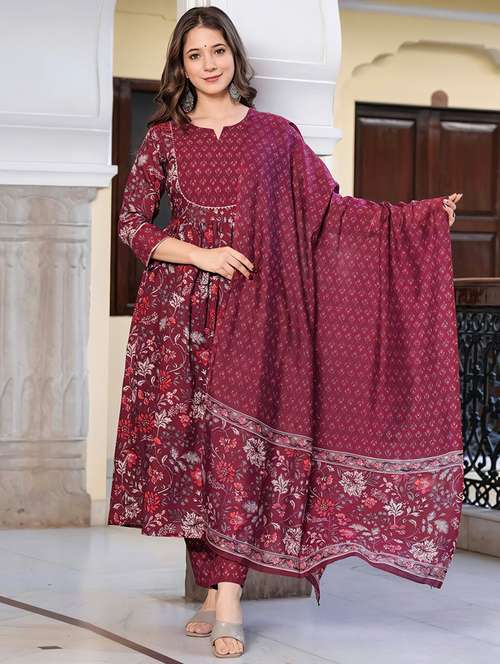 • Find gorgeous sets of ethnic wears in trending designs in burgundy colors suitable for casual wear of occasions.