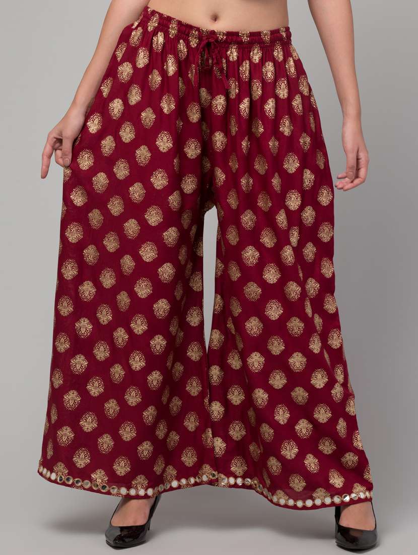 - » women foil print mid rise flared palazzo