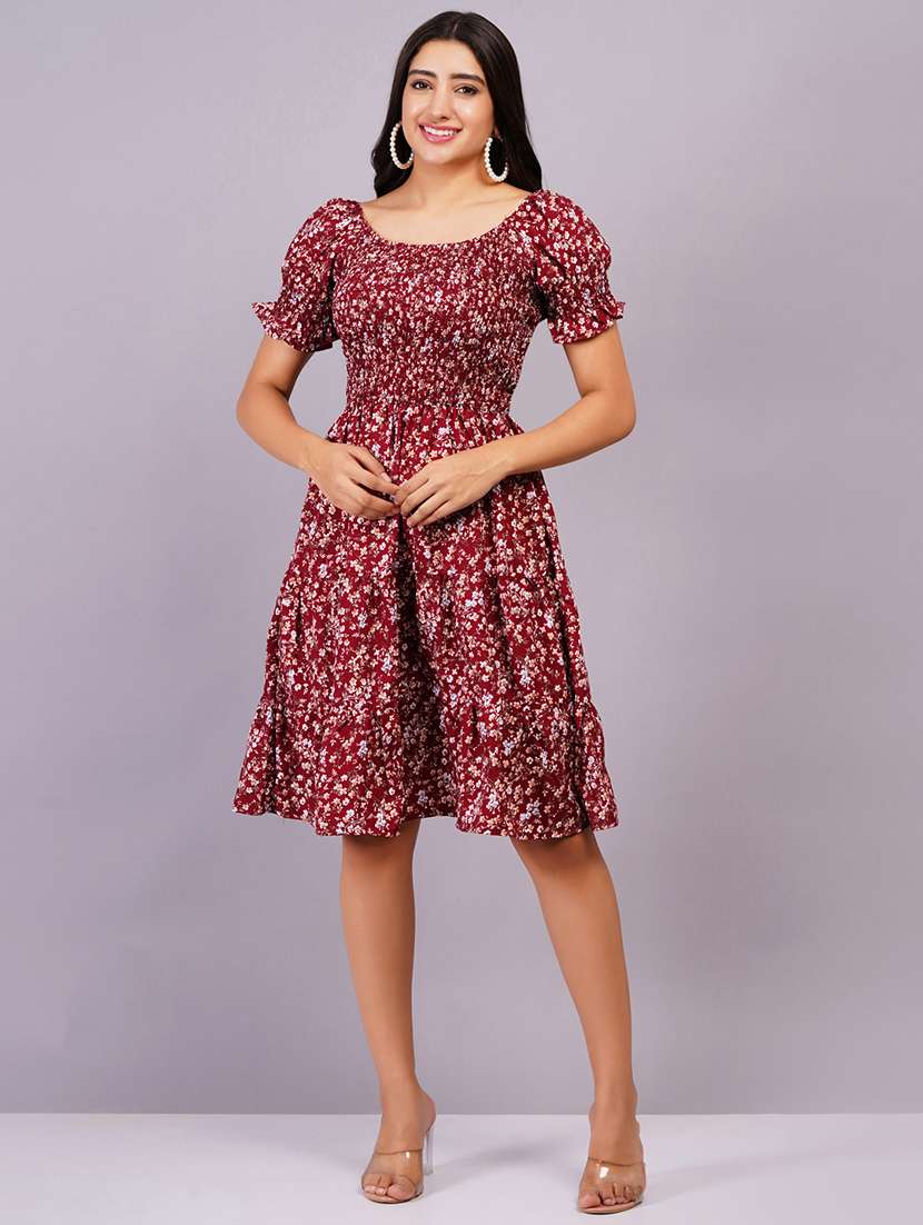 This charming dress is made from soft rayon fabric, featuring a Maroon background with a delicate floral print. It has a flattering square neckline, short puffed sleeves with ruffled cuffs, and a cinched waist that flows into a tiered, knee-length skirt. Perfect for casual outings or summer gatherings.