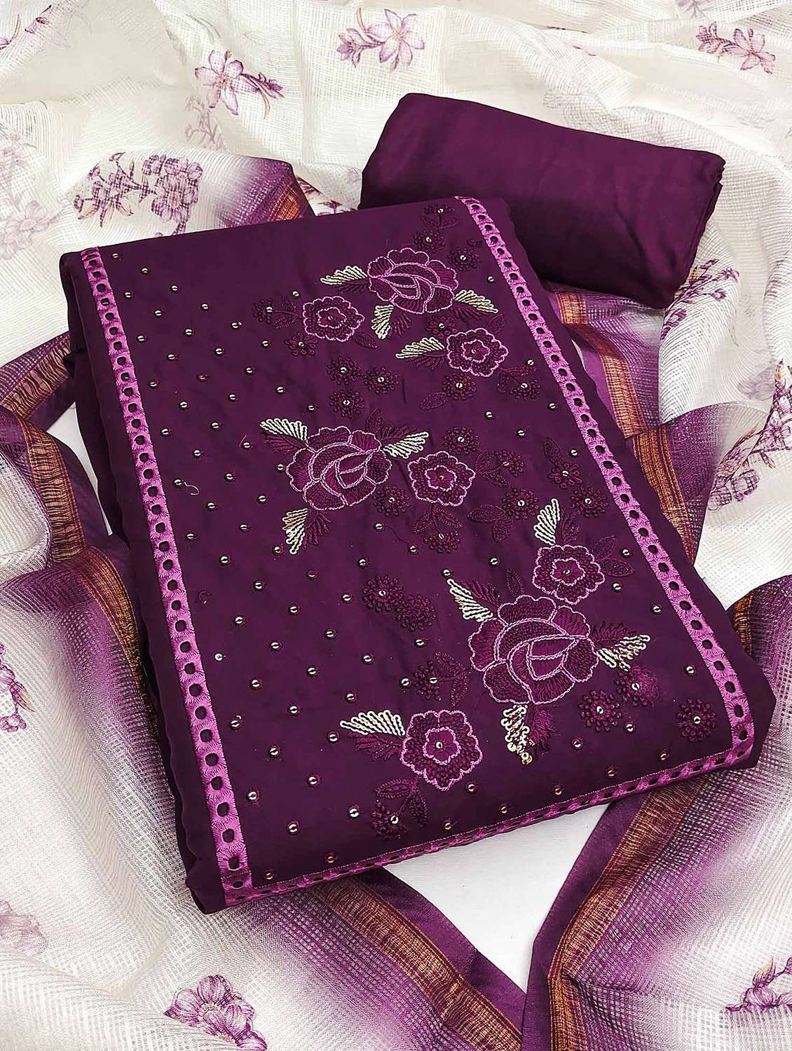 - Look ultra gorgeous in unstitched suits from Peachmode and grab these beautiful suits in purple colour.