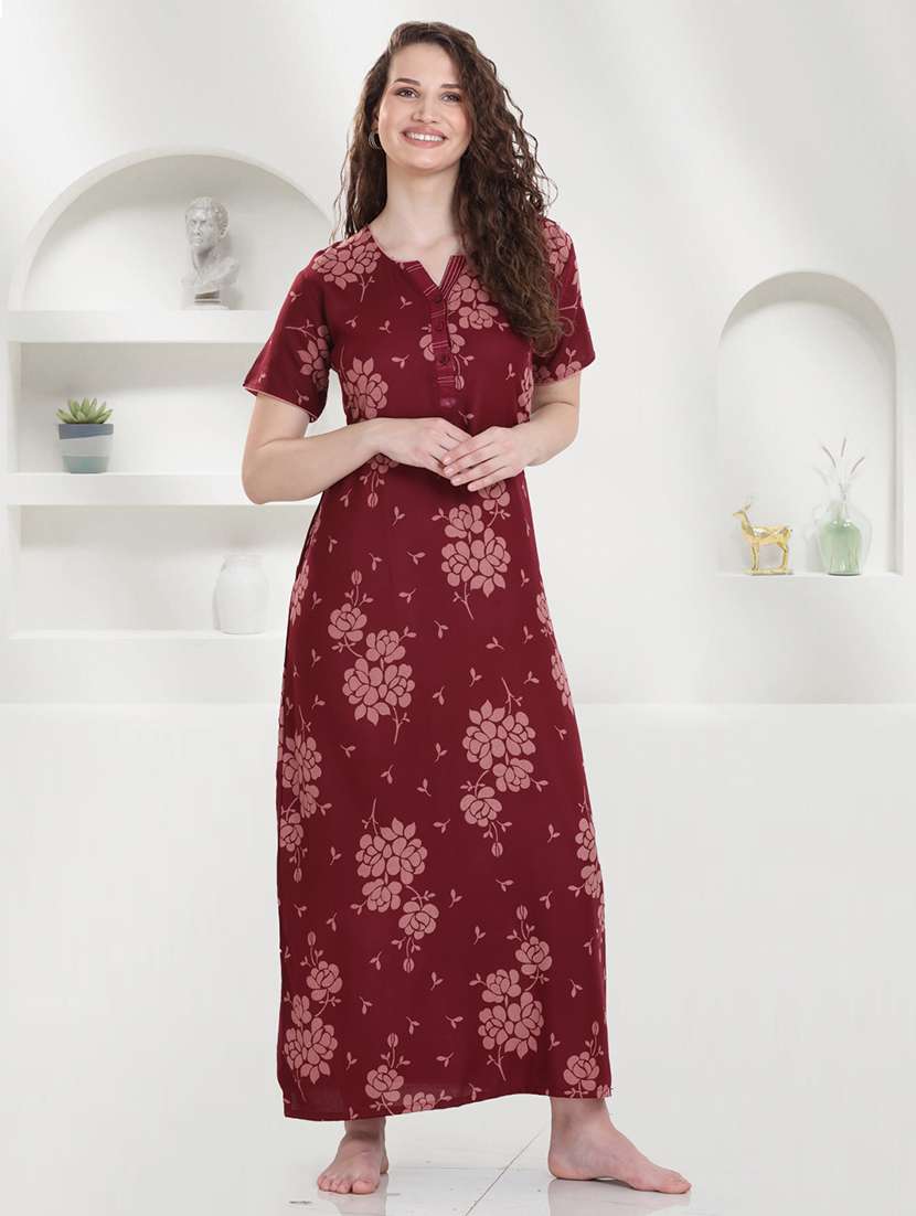 Quira Women's Viscose Polyester Printed Nighty - Half Sleeves, Round Neck, Full Length