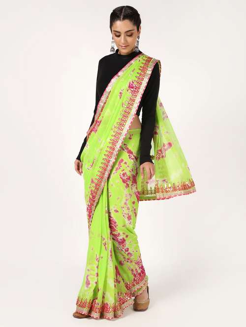 women's tie & dye neon colored saree with blouse - 16593706 - Very Small Image - 1
