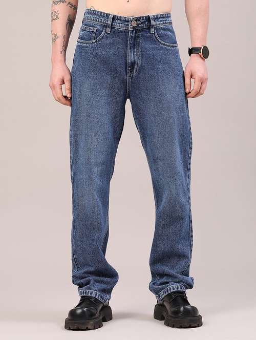 men blue plain mid rise baggy jeans