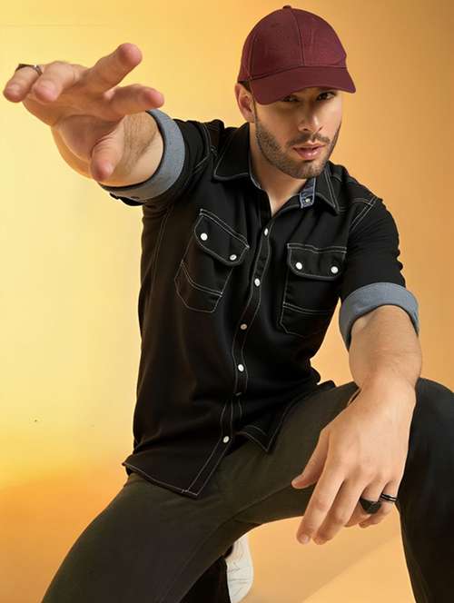 - » men solid long sleeve regular fit denim casual shirt