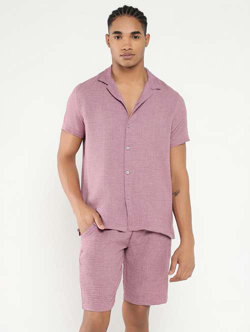 SHOWOFF Men's Mauve Solid Cuban Collar Co-Ords Set