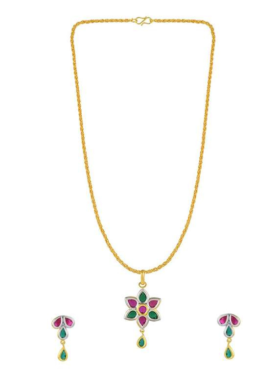 Brass Goldplated Floral design faux Emerald and Ruby Chain pendant set for Women. Looks rich and expensive, this pendant set is excellent for parties,wedding, engagement etc. A latest launch, this stylish Traditional look pendant looks fashionable and modern in appeal