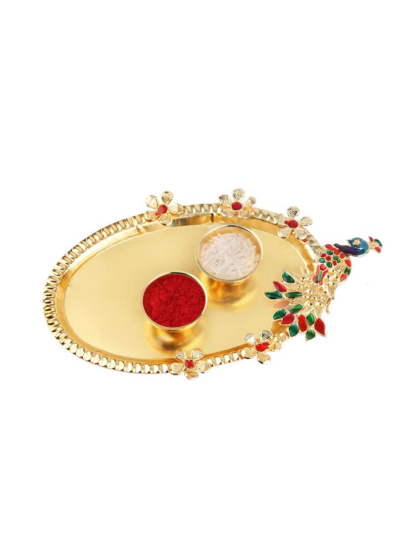 set of 2 rakhi with roli chawal kankawati thali and greeting card