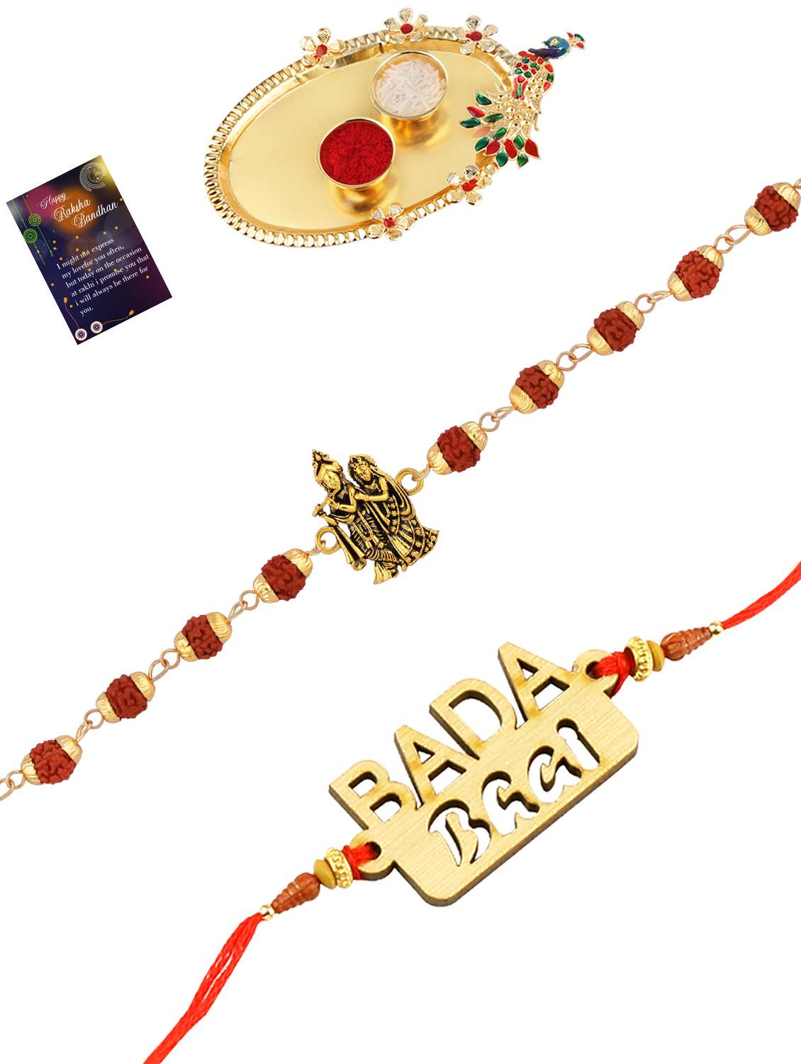 pack of 2 rakhi set with roli chawal, greeting card and pooja thali