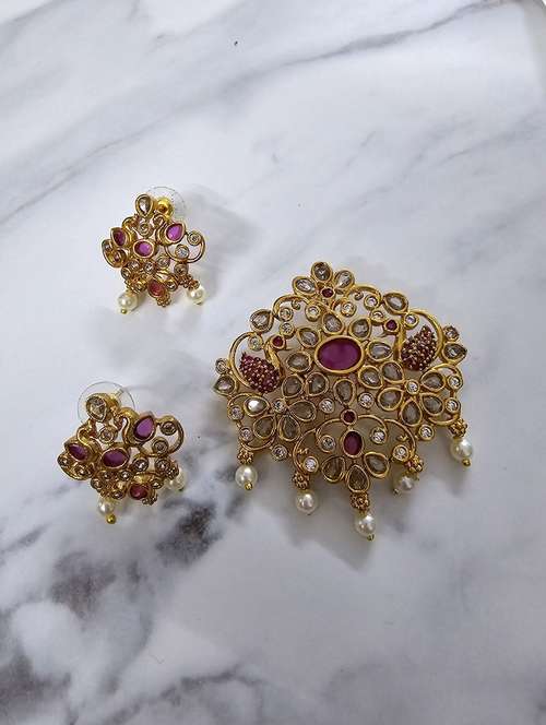 - Shop for exquisite designs of pendants and earrings made of brass materials and also decorated with lustrous stones to add more grace to your complete outfit.