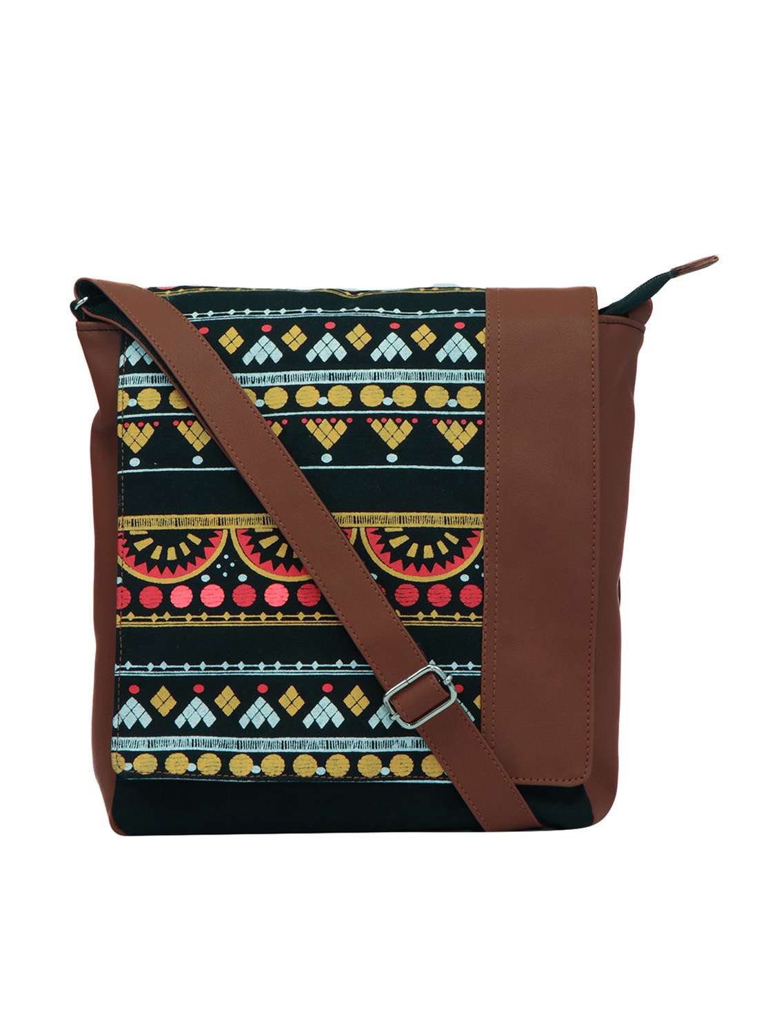 Black and Multicoloured Printed Canvas and PU Sling bag. Has a flap across the mouth secured with a magnetic button closure. One long adjustable sling strap. One main zip compartment with two slip pockets and one zip pocket inside. One external zip pocket at the back.