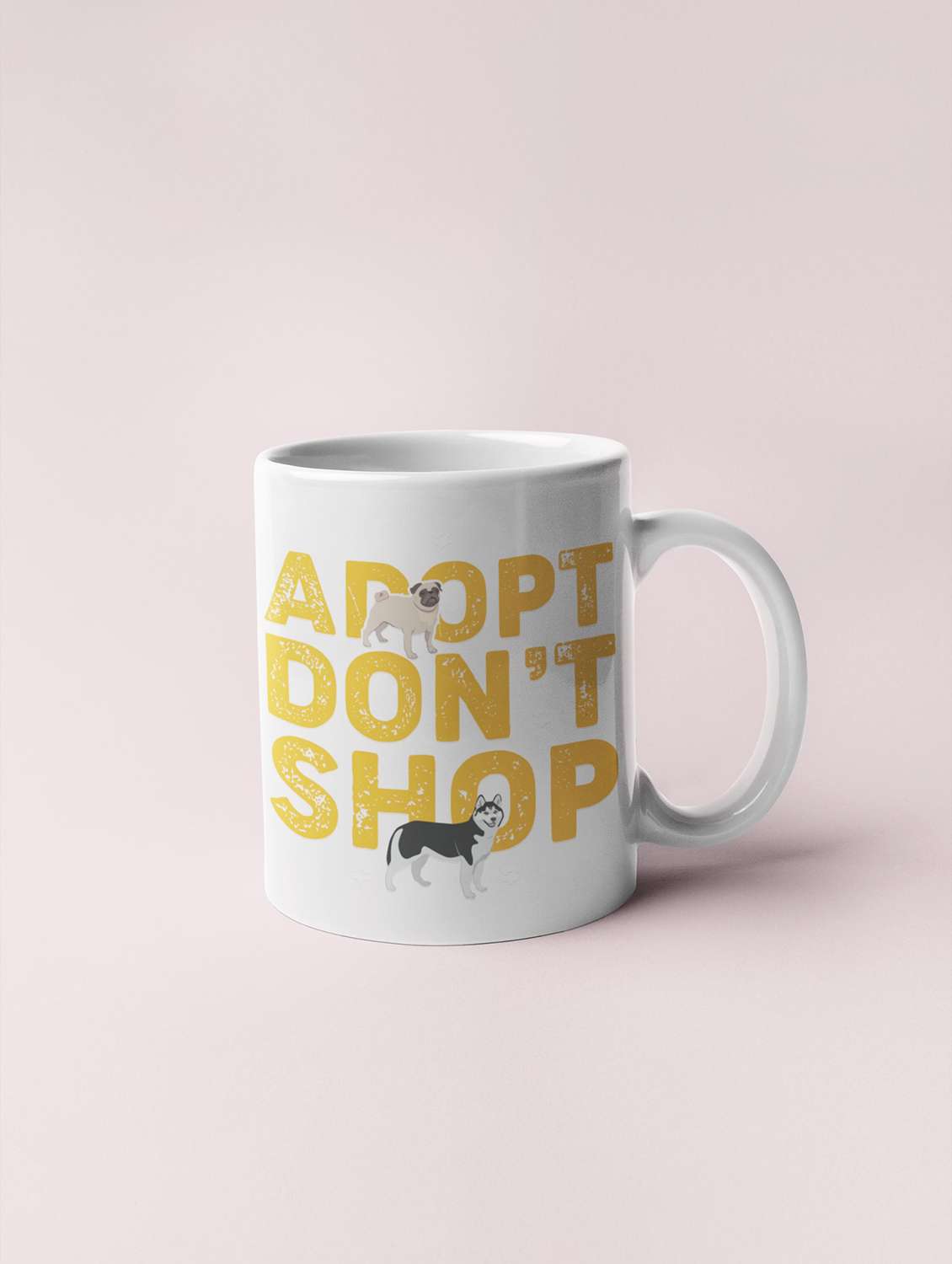 adopt, don't shop yellow text -printed coffee mugs for pet lovers