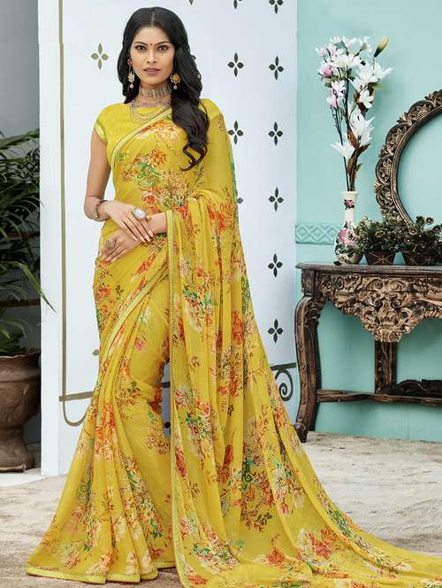 floral printed mustard saree with blouse - 15959287 - Very Small Image - 1