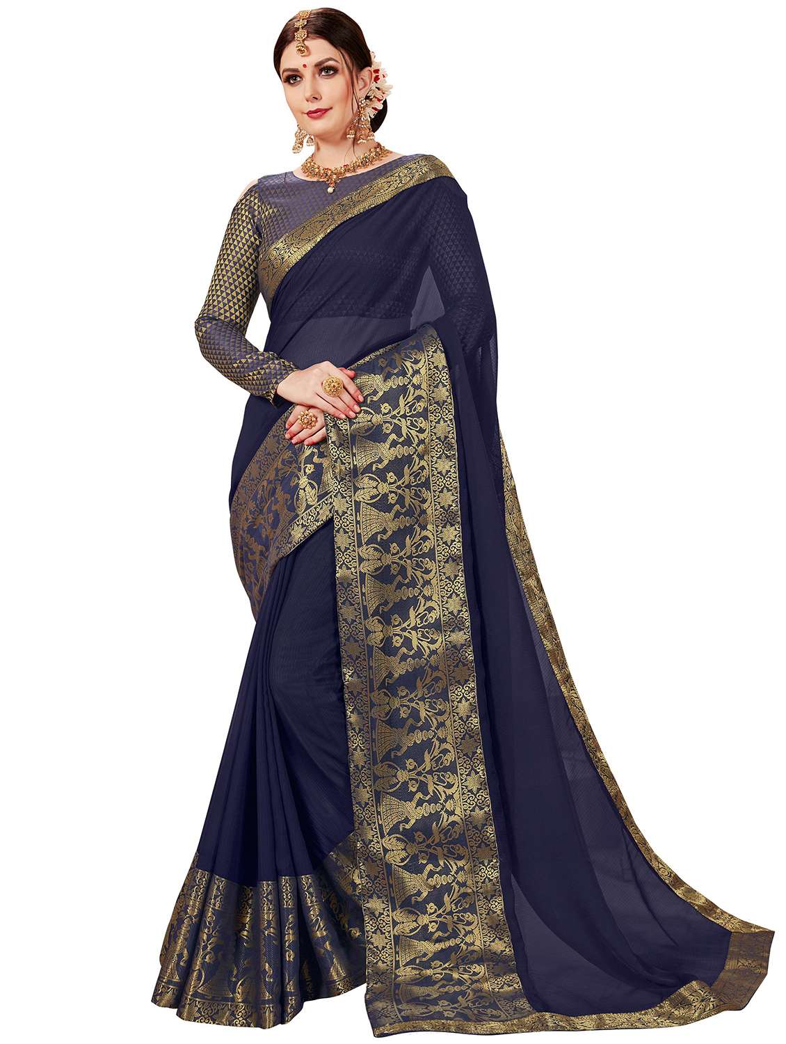 navy blue bordered saree with blouse