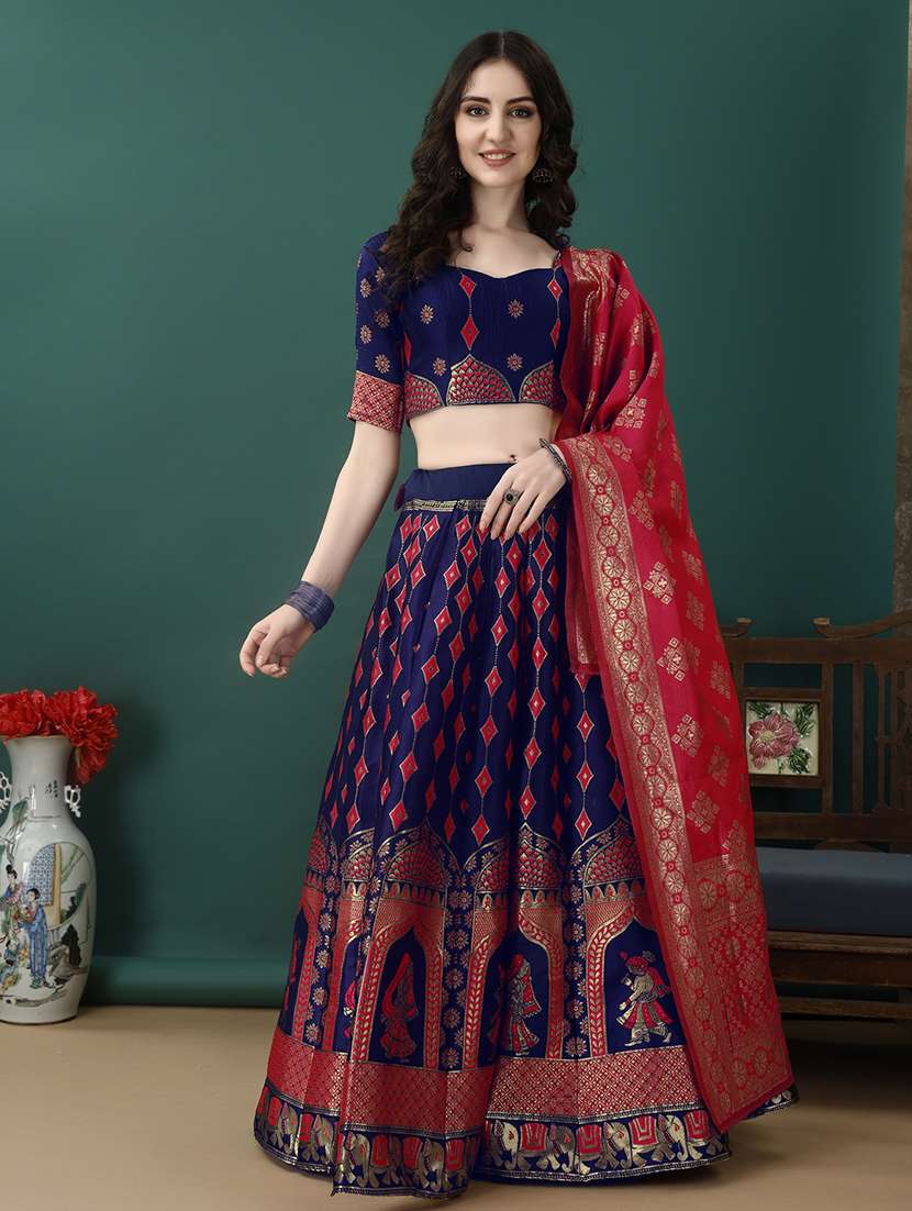 Color : Navy Red, Introducing our Women's Art Silk Fabric Jacquard Lehenga Choli. Our Lehenga Choli is made from high-quality Art Silk fabric. Art Silk is known for its lightweight and flowy nature, making it a perfect choice for a Art Silk that drapes beautifully. Lehenga is Comes 2.2 Meter Dupatta. Lehenga Length is 42 Inch. Lehenga Flared is 2.5 Mt. Lehenga is Stitched which can be fitted up to 40 inch Waist Size. Choli (Blouse) is unstitched and can be altered according to your fit and style that you require. Dry Clean Or Normal Hand Wash.