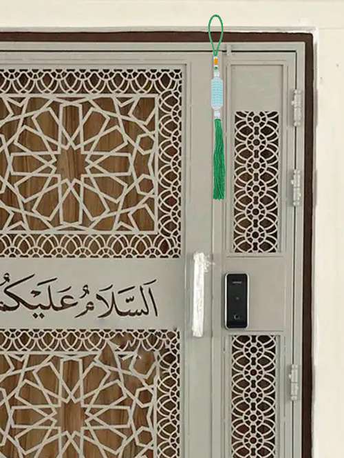 Elevate your space with this exquisite Islamic wall hanging featuring the 99 names of Allah inscribed in elegant blue coloured Arabic calligraphy. The centrepiece is a sophisticated cylindrical crystal design measuring 25 mm in width, adorned with intricate silver-toned embellishments. The graceful green silken tassel adds a touch of traditional elegance, while the matching green cord provides convenient hanging options. At 14 inches in length, this versatile Mulsim Islamic home decor piece makes a striking statement whether displayed in your home, office, or car. The light blue background of the crystal cylinder beautifully complements the carefully etched sacred text, creating a serene visual appeal. The premium craftsmanship is evident in every detail, from the ornate metallic accents to the luxurious flowing tassel. This thoughtfully designed decorative piece serves as both a meaningful spiritual symbol and an elegant architectural accent, perfect for adding a touch of grace to any setting.