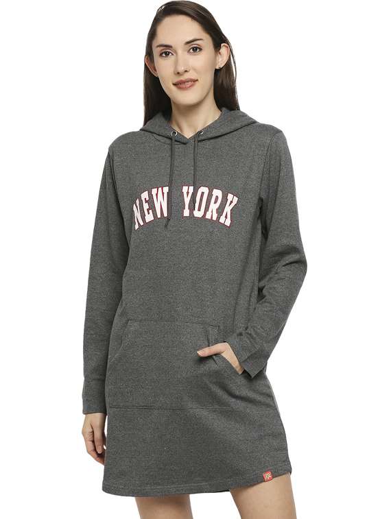 - » women hood neck typographic printed t-shirt dress