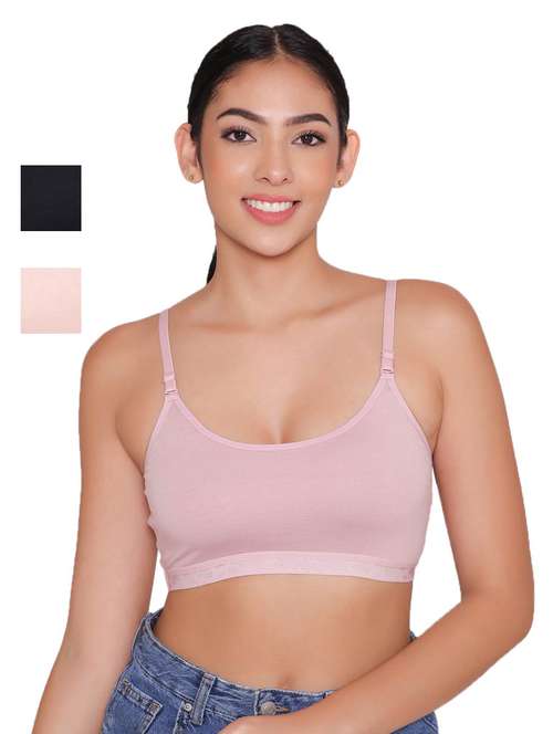 A bra that has a very soft and supportive fabric to give comfort and coverage to the growing breasts of girls. A teenager should normally go for a bra when her breasts need coverage to protect them from excessive motion and to keep them in shape. The correct time to start wearing a bra is when you start developing breasts which are around 12 years on average. This teenager bra for girls has full coverage double layered fabric in front to provide a seamless and smooth finish under all types of clothing. Made with 95% Cotton and 5% Lycra, this teenager bra for girls 13-14 years will give you complete support and fit all day. Easy slip on design which can be worn just like a tshirt .The Adjustable straps give you the flexibility to decide your lift and move around with ease. This sports bra for girls has a high strength stretchable cotton fabric for better support and modesty. This bra will help girls to easily transition to a full cup bra later. The design ensures healthy development of breasts at a young age. This teenagers’s bra is full coverage and provides you the desired support. Use it as a Lounge bra, work from home bra or simply everyday comfort bra. This Combo of 2 sports bra is Available in 6 colors and sizes from 30B-38B.