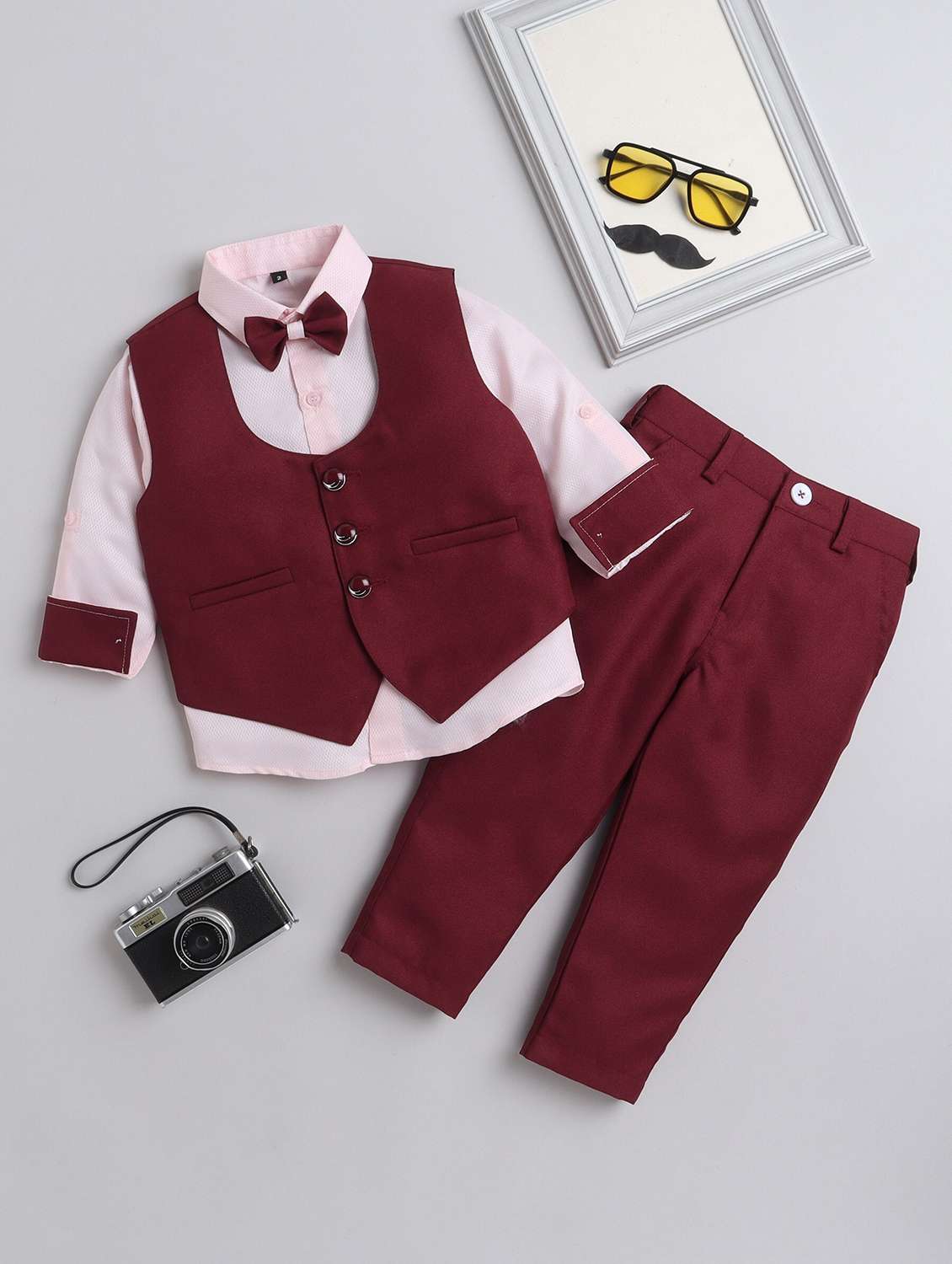 boys shirt neck solid full length set with vest